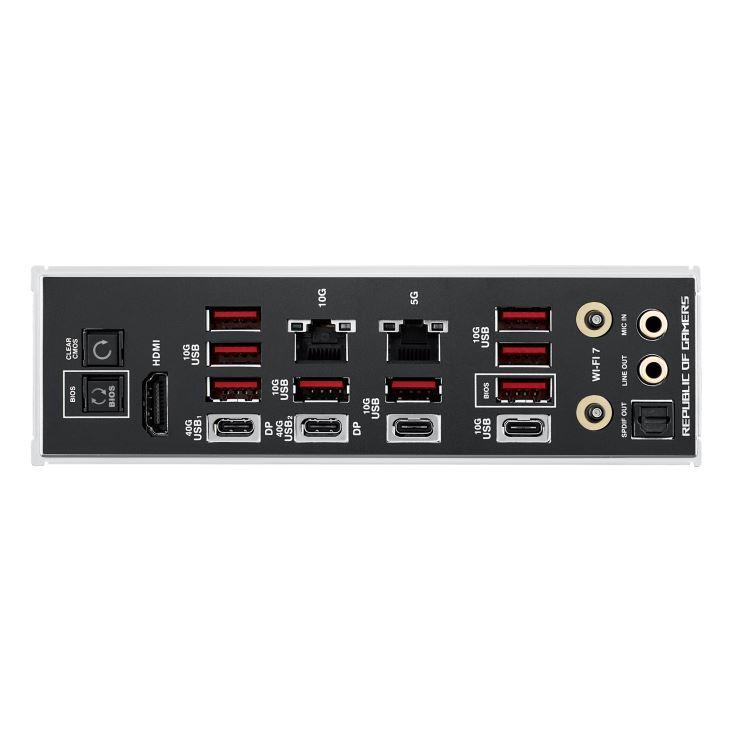 Az ASUS ROG CROSSHAIR X870E EXTREME alaplap bővelkedik a legújabb generációs portokban. Két darab USB4® Type-C® csatlakozó akár 40 Gbps sebességgel, valamint tíz darab 10 Gbps USB-port (nyolc Type-A és két Type-C®) gondoskodik arról, hogy minden eszköz gyorsan és kényelmesen csatlakoztatható legyen – legyen szó külső SSD-ről, VR headsetről vagy bármilyen perifériáról.