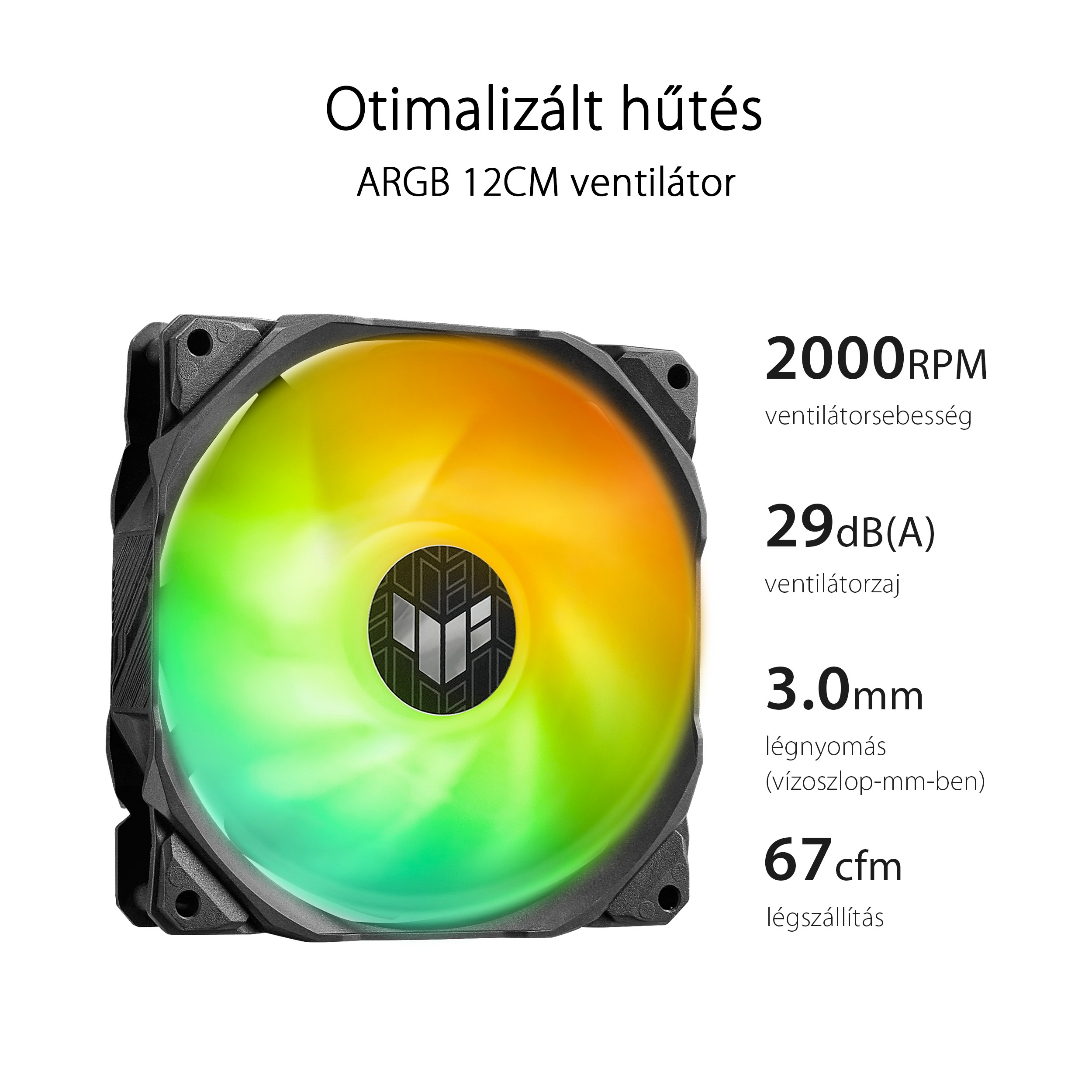 A fantasztikus színekben ragyogó TUF Gaming LC II ARGB hűtők az épített géped díszei lehetnek. A radiátorventilátorok és a szivattyúház TUF Gaming logója Aura ARGB fényekben tündököl. A színek hozzáigazíthatók a rendszeredhez, ezzel valóban egyedi, egységes látványt hozhatsz létre.