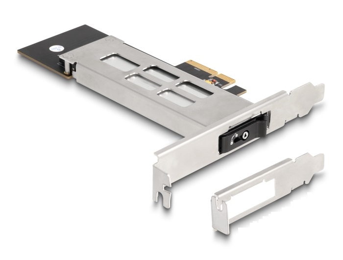 Ez a Delock mobil-rack rögzíthető a számítógép egy szabad PC csatlakoztatójába és M.2 csatlakozó felületként működik 2280, 2260, 2242 vagy 2230 formátumban. A SSD gyors cseréje A speciális mechanizmusnak köszönhetően a SSD gyorsan és könnyen cserélhetők. Például az adatok biztonsági mentése kivehető és biztonságos helyen tárolható. Tálca kulcs zárakkal és rugókkal A mobil rack kulcszárral van ellátva, ami megakadályozza az illetéktelen hozzáférést. A fém biztos hordozó rugókkal ellátott a felső és alsó részen ezzel csökkentve a vibrációt. Megjegyzés Különös figyelmet kell fordítani hogy a sín tökéletesen csatlakoztatva van, különben az SSD-hez nem létesíthető kapcsolat. Műszaki adatok Csatlakozó: PCIe kártya: 1 x PCI Express x4, V4.0 1 x M.2 M-kulcs nyílás M.2 tálca: 1 x M.2 M-kulcs dugó 1 x M.2 M-kulcs nyílás Csatolófelület: PCIe / NVMe M.2 modulok használatát támogatja 2280, 2260, 2242 és 2230 formátumban PCIe alapú M- vagy B+M-kulccsal Az összetevők maximális magassága a modulon: A kétoldalas összeszerelt modulok 1,5 mm-es alkalmazása támogatott 1 x LED jelzőfény Indítható, UEFI 2.3.1 támogatással rendelkezik M.2 tálca fémből Támogatja a NVM Express (NVMe) használatát Támogatja a S.M.A.R.T. használatát Működési hőmérséklet: -40 C ~ 85 C Rendszerkövetelmények Linux Kernel 5.15 vagy újabb Windows 10/10-64/11 Windows Server 2022 PC egy szabad PCI Express x4 / x8 / x16 / x32 illesztőhellyel A csomag tartalma Mobil keret M.2 tálca Kisméretű konzol Hűtőborda Csavarok 2 x kulcs Használati utasítás Csomag DobozGyártó: Delock