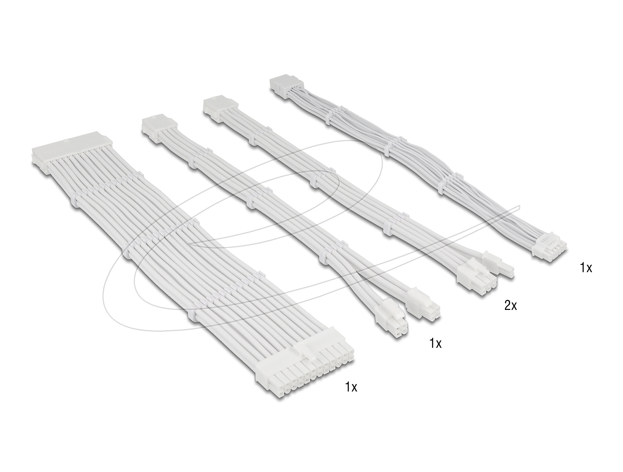 Delock Tápkábel-hosszabbító készlet, 30 cm, 5 darabos, fehér, harisnyázott kivitelben, kábelfésűkkel (1 x 24 tűs ATX, 1 x 12 + 4 tűs 12VHPWR PCIe 5.0,