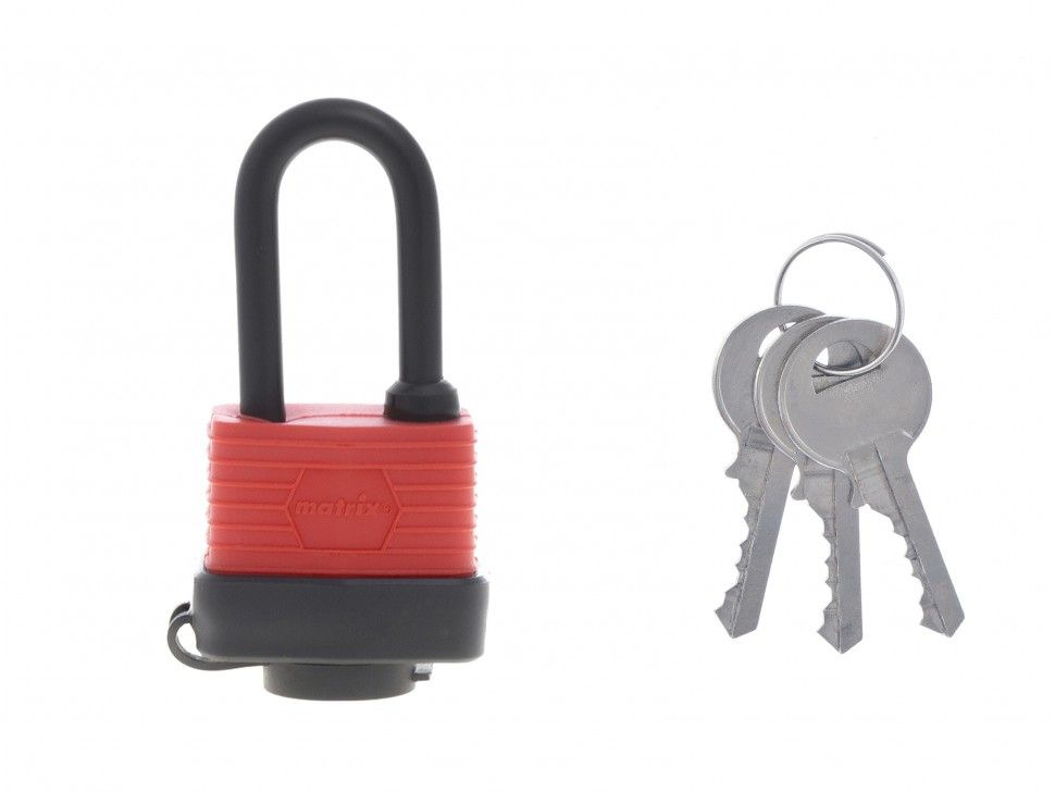 Zárt műanyag burkolatú lakat Matrix 40 mm, hogy megvédje a ingatlanát és ingóságait. Segítségével megvédheti pajtáját, garázsát, pincéjét és egyéb helyiségeit az illetéktelen behatolástól. A test gumírozott bevonata biztosítja a zár tömítését, növelve annak korrózióval és környezeti hatásokkal szembeni ellenállását. Jól használható akár csónakok ladikok biztonságos zárására, vagy bármely víznek és időjárásnak kitett helyen.Előnyök A magas fokú védelmet az edzett acél kengyel és a komplex kialakítású acél test biztosítja.A kulcs nyílása speciális burkolattal van felszerelve, amely megakadályozza, hogy víz kerüljön a zárba megvédve azt a fagyástól és a korróziótól.A zárrészek közötti hézagok minimálisak, ami biztosítja annak megbízhatóságát és tartósságát.Az ív szárai meghosszabbítottak, speciális helyekre tervezve