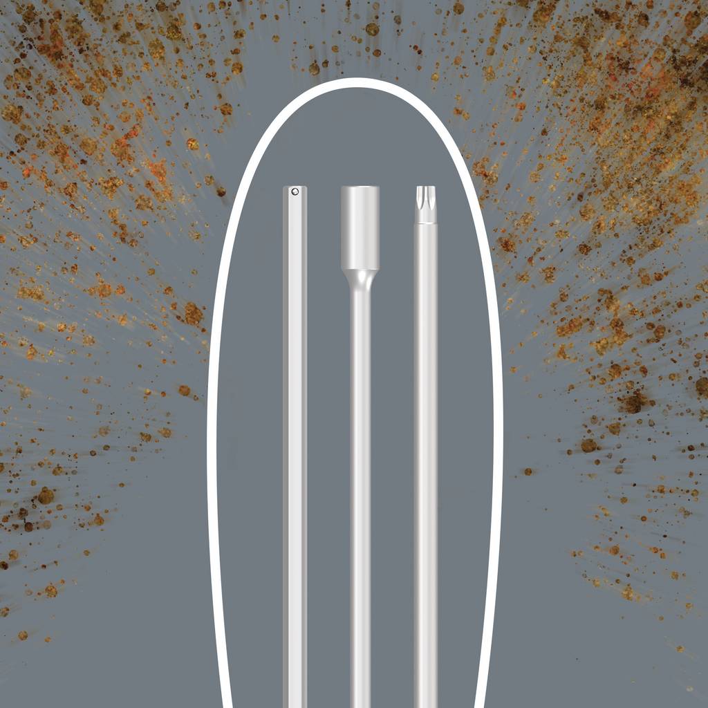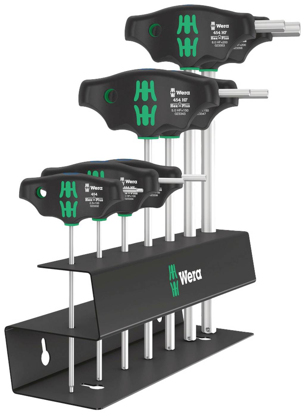 T-fogantyús csavarhúzó: A fogantyú ideális formája különösen nagy meghúzási és lazítási nyomatékok átvitelét teszi lehetővé. A markolat ergonomikus formája jól kitölti a kézgolyót, az ujjak biztonságosan fekszenek a lágyan lekerekített süllyesztett markolatokban. Az egész kéz érintkezik a fogantyúval, és elkerülhető a kéz és a nyél közötti súrlódási veszteség. Tartó funkcióval az imbuszcsavar biztonságos rögzítéséhez a szerszámon. Speciális felületkezelés a magas korrózióvédelem és az optimális illesztési pontosság érdekében a csavarban. Tartalmaz egy fém állványt a tároláshoz. Az állvány a munkapadra helyezhető, vagy a szerszám falába akasztható.