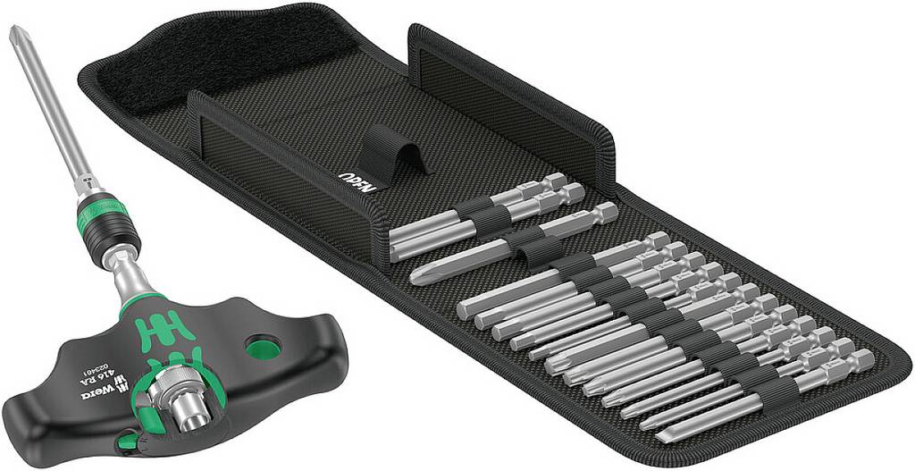 17 részes textildoboz 1 T-fogantyús bittartóval 416 RA racsnis funkcióval és Rapidaptor gyorsváltó tokmányral, 16 szívós bit, 1/4" , 89 mm hosszú
