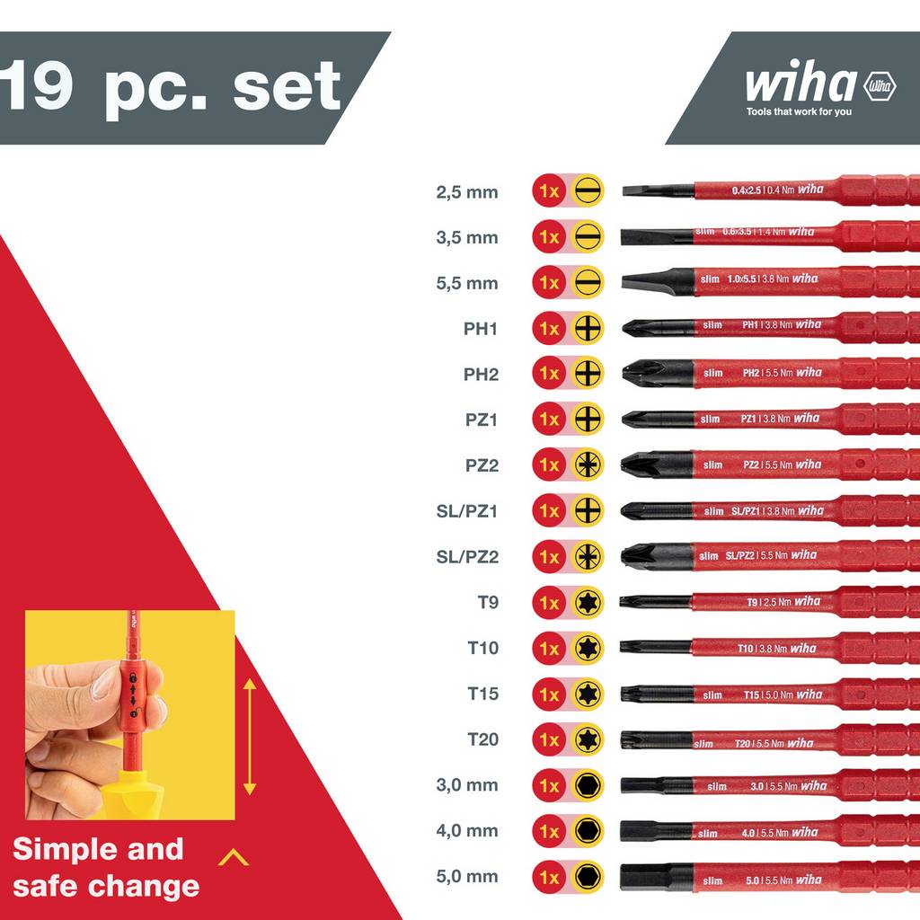 Különböző helyszíneken, például építkezéseken, napelemes rendszereknél és vezérlőszekrényekben végzett munkák során sokféle csavarprofilra van szükség. A slimVario® csavarhúzó és bitkészlet minden elterjedt csavarprofilt lefed, így rugalmasan használható. Biztonságosan tárolva és rendszerezve egy strapabíró táskában, a villanyszerelő szerszámok tökéletesek mobil használatra. A 19 darabos szerszámkészlet optimális helymegtakarítást kínál a kiterjedt cserélhető bitrendszernek köszönhetően. A Wiha slimTechnology-nak köszönhetően a mellékelt slimBitek akár 33%-kal karcsúbb pengéjükkel könnyedén elérik a mélyen fekvő csavar- és rugóelemeket is. A különösen rövid, tömör nyélnek köszönhetően a csavarok könnyedén elérhetők, különösen szűk helyeken. A hosszanti fogantyút mélyen fekvő csavarokhoz és nagyobb erőátvitelhez használják. A készlet minden egyes szerszámát rutinszerű tesztelésnek vetették alá az IEC 60900 nemzetközi szabvány szerint, és lehetővé teszik a biztonságos munkát akár 1000 V AC feszültségű feszültség alatt álló alkatrészek közelében.
