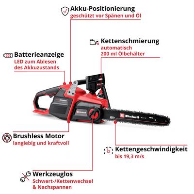 Az Einhell Professional GP-LC 36/40 Li BL-Solo akkus láncfűrész megbízható eszköz közepes és nagy fák ritkítására és kivágására, tűzifa megmunkálására, valamint építőipari fa rövidítésére és darabolására. A készüléket egy Einhell kefe nélküli motor hajtja. Ez a szénkefe nélküli motor nagyobb teljesítményt és hosszabb működési időt biztosít, mint a hagyományos szénkefe motorok. A 38 cm-es vágási hosszúságú láncfűrész kiváló minőségű OREGON lánccal van felszerelve, 1,3 mm-es hajtószem vastagsággal, 56 hajtószemmel és 3/8" -os láncosztással. A visszarúgás elleni védelem mechanikus azonnali láncfékkel biztosítja a felhasználó optimális biztonságát. Egy láncrögzítő csavar azonnal megfogja a láncot, ha az kilazulna. A robusztus fém karmos ütköző biztonságos és kényelmes vezetést biztosít minden munka során, az ergonomikus, puha markolatú fogantyú pedig szilárd és kényelmes fogást biztosít. Nincs szükség szerszámra a lánc cseréjéhez vagy a lánc feszességének beállításához. A fűrészláncot folyamatosan és teljesen automatikusan ellátja olajjal a 230 ml-es olajtartályból. A töltési szint bármikor leolvasható a tartályon lévő kémlelőüvegen keresztül. Közvetlenül a Professional akkus láncfűrészhez egy 3 fokozatú LED kijelző csatlakozik, amely a használt akkumulátorok aktuális töltöttségi szintjét mutatja. A még jobb kezelhetőség érdekében az akkumulátorok oldalt helyezkednek el. Ez nem csak az akkumulátorok védelmét biztosítja, hanem a láncfűrész optimális egyensúlyát is. Az Einhell Professional GP-LC 36/40 Li BL-Solo akkumulátoros láncfűrészt akkumulátor és töltő nélkül szállítjuk.