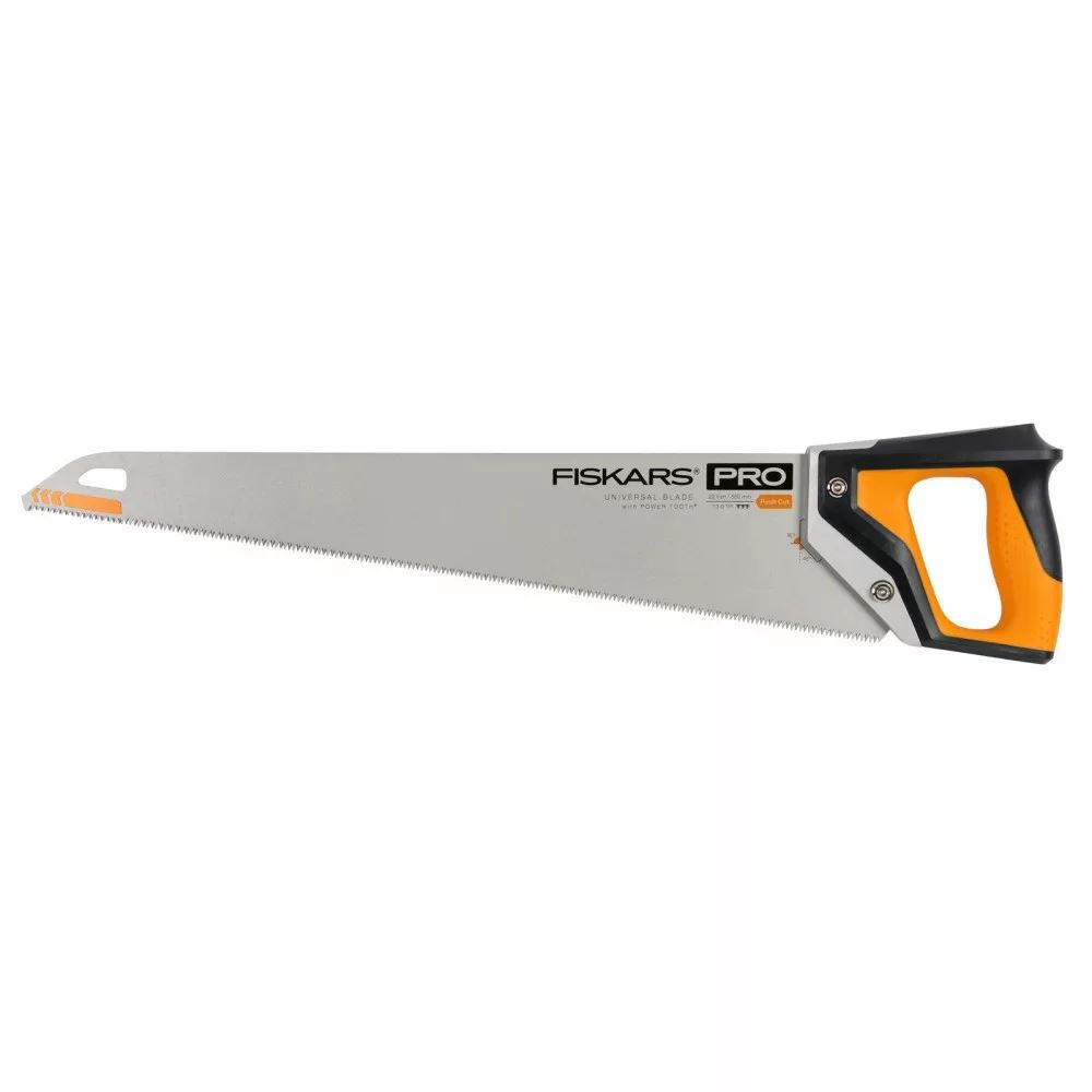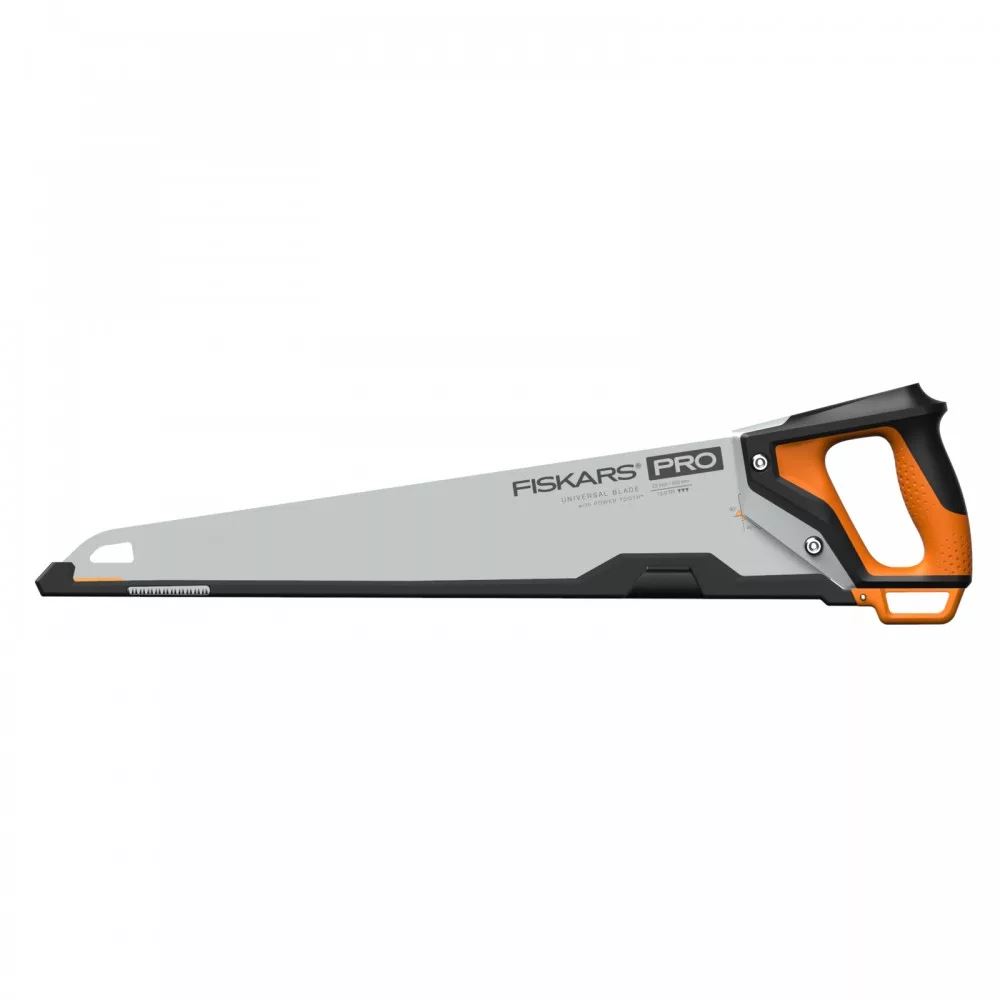 A Fiskars Pro Power ToothTM durva élű kézi fűrész erőteljes, könnyen kezelhető és durva vágású fogprofillal rendelkezik. A borotvaéles, hármas csiszolású penge gyors, erőteljes vágást biztosít fán, laminált elemeken, PVC-n és más felületeken. A penge RapidStartTM technológiájának köszönhetően több foga van a hegy közelében, így gyorsabb, tisztább, és jobban irányított a vágás és gyakorlatilag nincs elakadás. A hármas csiszolású penge többi része 7 TPI-s az erőteljes, gyors vágáshoz, míg a fogantyú tetején lévő speciális kialakítás kétkezes fogást tesz lehetővé a maximális teljesítmény és irányítás érdekében. Az ergonómiai jellemzők közé tartozik a túlméretezett fogantyú a nagyobb, kesztyűs kezekhez, a megnövelt ujjhely a pontosság érdekében, valamint az innovatív SoftGrip borítás, amely elvezeti a nedvességet, megakadályozza a hólyagosodást és növeli a tapadást csúszásmentes fogást biztosítva. A penge hosszan tartó élességet kínál, indukciósan edzett fogakkal és alacsony súrlódású, rozsdaálló bevonattal. A pengevédő biztonságot nyújt a tárolás során, illetve beépített ceruzatartóval is rendelkezik.