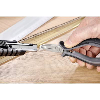Elektronikai lapos fogóElektronikai lapos fogó DIN ISO 9655 szerint, CV acél, matt szatén bevonat, karcsú forma, 2 komponensű fogantyú az optimális erőátvitelhez és fáradtságmentes munkavégzéshez, önnyitás, elektronikai alkatrészek és precíziós mechanika munkákhoz, különösen alkalmas megfogásra, pozícionálására és vágására, vezetékek vagy kábelek pontos beállítására. A műhelybe való praktikus fogótartóval a műanyag kapocs egyszerűen a szerszám falához csavarható.Ez a szöveg gépi fordítással készült.Műszaki adatok: Méret, hossz: 120 mm