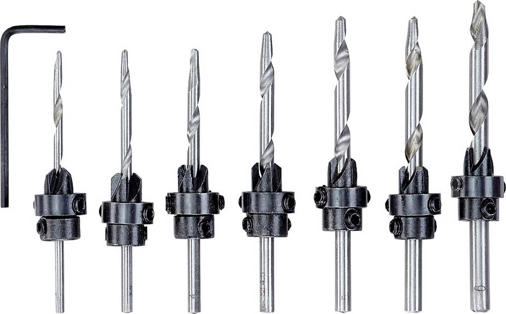 8 részes süllyesztett fúrókészlet a legelterjedtebb méretek egy készletben: 3,0, 3,5, 4,0, 4,5, 5,0, 5,5 és 6,0 mm, C45 acélból, 4 élű fúró mellékelt süllyesztővel, mélységben állítható süllyesztő, mélységütközővel, fúráshoz és süllyesztéshez egyidejűleg lyukak puha fában, lehetővé teszi a csavar egy síkban történő becsavarását, kerek szárral, imbuszkulccsal, buborékfóliás tárolótasakban.