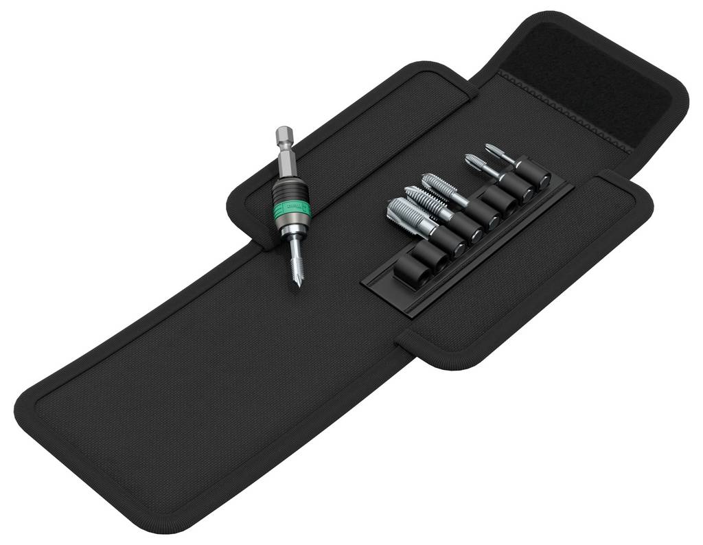 Package contents: 844/7 menetfúró bit készlet, 8 db,1x 888/4/1 K Rapidaptor univerzális tartó: 1/4" x 50 mm,6x 844 egycsapos csapfejek: 3 mm x 33 mm x M3, 4 mm x 35 mm x M4, 5 mm x 36 mm x M5, 6 mm x 40 mm x M6, 8 mm x 40 mm x M8, 10 mm x 40 mm x M10,1x 9499 Összecsukható táska 844/7-es csapszeghez, szerszám nélkül: 90 x 115 mm