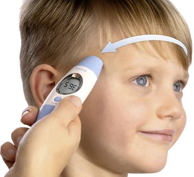 Messung an der Stirn:Ha a homlokán mér, vegye figyelembe, hogy az infravörös érzékelőnek érintkeznie kell a bőrrel. Ehhez érintse meg az egyik templomot, tartsa lenyomva a bekapcsológombot, és lassan húzza a hőmérőt a másik templomhoz, állandó bőrrel érintkezve.