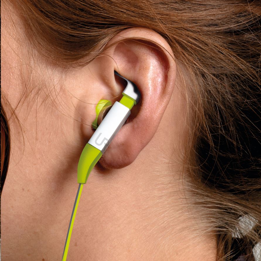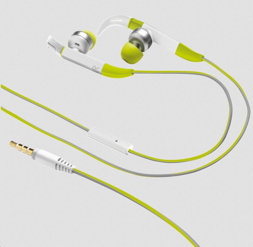Fülbe illeszthető sport fülhallgatók állítható fülhoroggal és vezetékbe épített mikrofonnal.