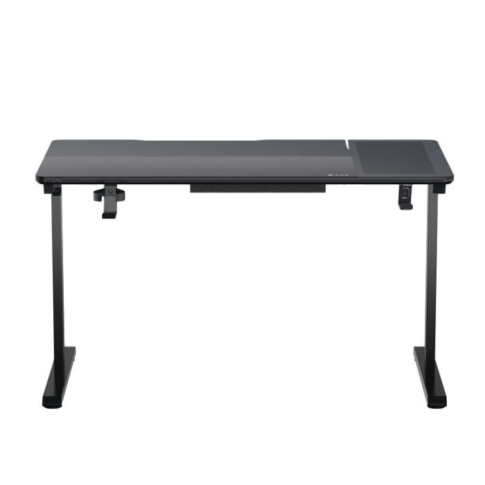 Az asztallapot kifejezetten használhatóságra tervezték. A jobb oldali külső részen mesh panelek találhatók, amelyek javítják a légáramlást a számítógép körül. Ha a PC-t erre a mesh felületre helyezed, a jobb szellőzés segítheti a hűtést. A középső elülső rész edzett üveg panelt kapott. Ez prémium megjelenést ad, és a leírás alapján pontos egérkövetést tesz lehetővé, ezért sok esetben nincs szükség külön egérpadra.