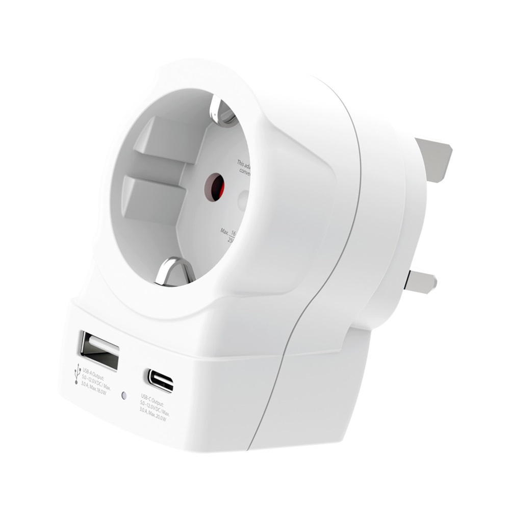 A SKROSS® Europe to UK USB megbízható és egyszerű csatlakozást biztosít Schuko vagy Euro dugós európai eszközöknek a brit (UK) aljzatba. Biztonságosan támogatja a nagyobb teljesítményű készülékeket is (pl. laptop, hajszárító), miközben két USB-eszköz egyidejű töltését is lehetővé teszi (USB-A + USB-C).