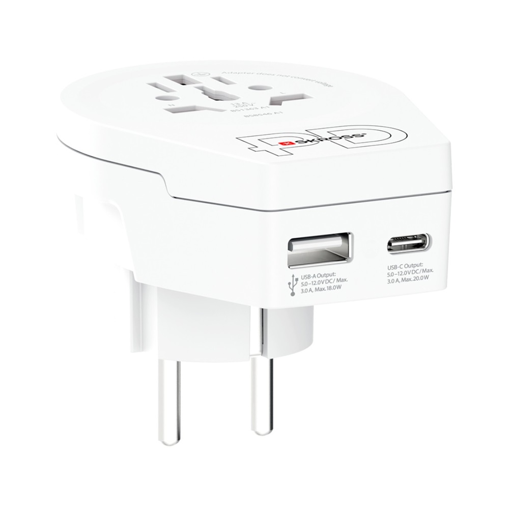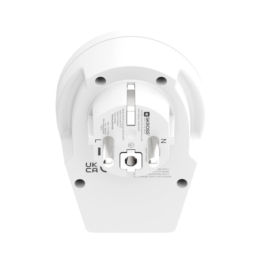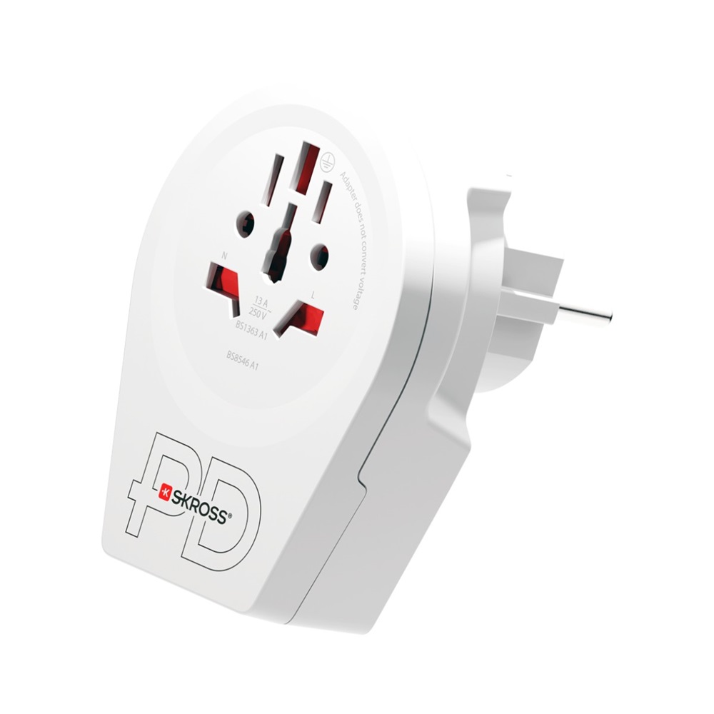 A SKROSS® World to Europe USB AC20PD egy kompakt és megbízható országadapter, amely lehetővé teszi 2- és 3-pólusú készülékek biztonságos csatlakoztatását az európai Schuko aljzatokhoz, több mint 90 úti célon világszerte. Az integrált USB-A + USB-C PD töltő segítségével egyszerre két eszköz tölthető gyors, akár 20 W-os teljesítménnyel, így ideális választás utazóknak, akiknek fontos a mobiltelefonok, tabletek és más eszközök gyors feltöltése.