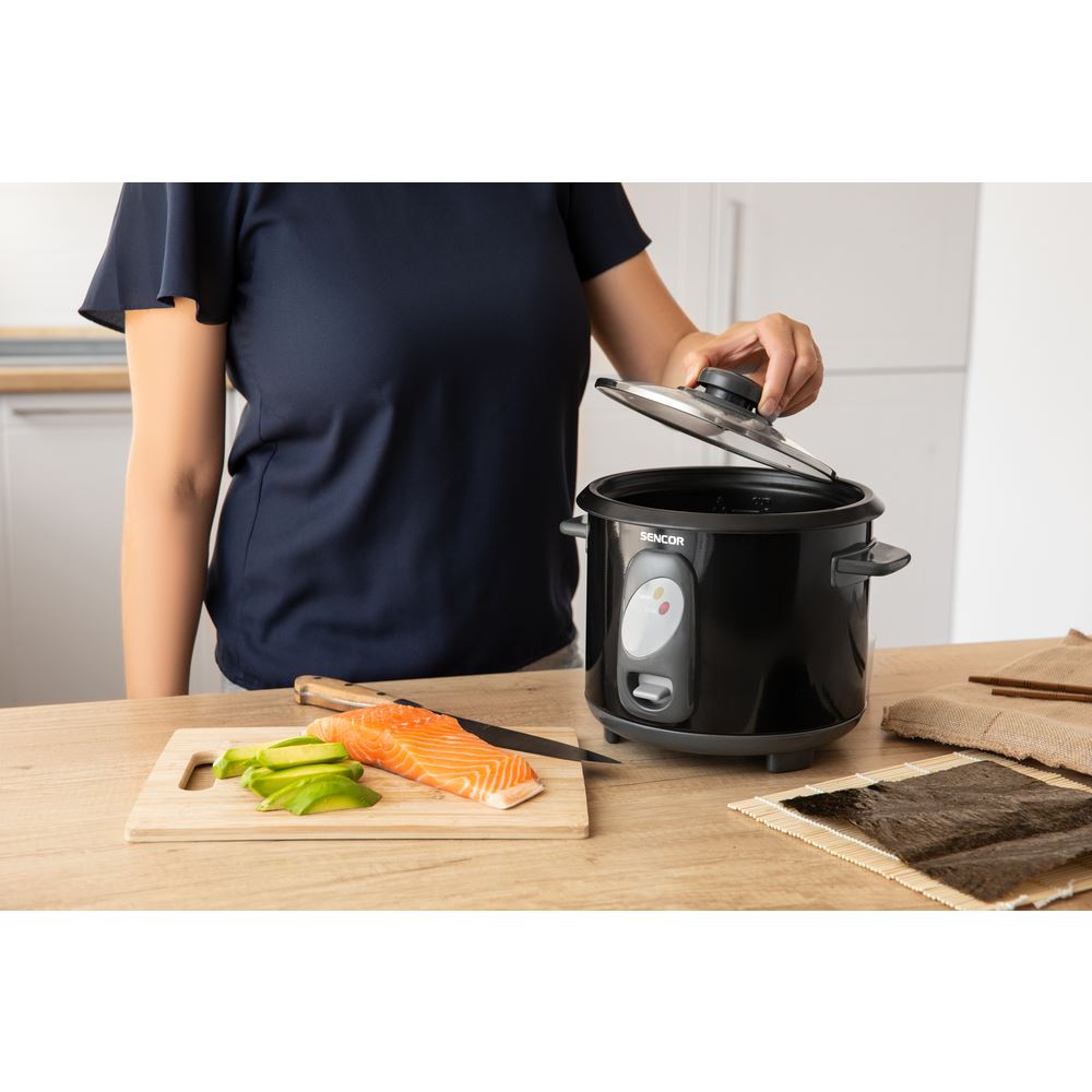 A Sencor SRM 1001BK egy speciális elektromos főzőedény rizs készítésére. Bármilyen típusú rizs elkészítésére kiválóan alkalmas a normál fehér rizstől, a különleges sushi rizsig. A készülék a gőz segítségével készíti el a rizst, a készülék tetején kialakított nyíláson távozik a felesleges mennyiségű pára. A rizsfőző akár 400 W teljesítményt is elérheti, az kapacitása pedig 1,0 liter, amely kb. 800 g rizs elkészítésére alkalmas. A speciális belső kialakításnak köszönhetően az étel nem tapad le, így könnnyen és egyszerűen kivehető és tisztítható. A rizsfőző folyamat végeztével a készülék automatikusan egy melegen tartó üzemmódba kapcsol, mellyel akár 6 órán keresztül is melegen tartható az elkészült rizs.