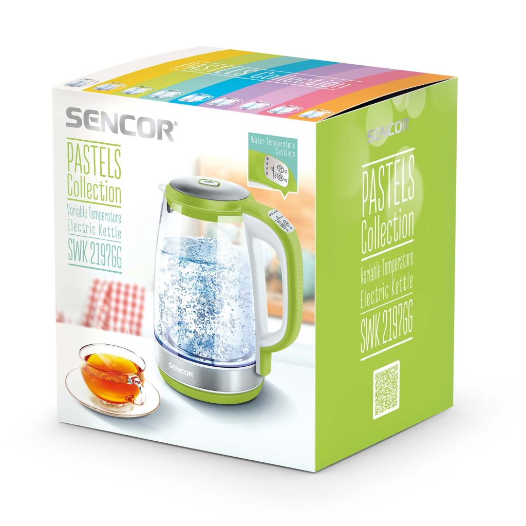 A Sencor SWK 2197GG stílusos és praktikus elektromos üveg vízforraló. A maximális kapacitása 2,0 liter és az anyagát tekintve kiváló minőségű üveg nemesacél kombináció. A vízforraló 2200 W teljesítményének köszönhetően gyorsan felmelegíti a vizet. A tökéletes ízélmény elérését az elektronikus hőmérséklet-szabályozó (50–100 °C) segíti. Az elkészült forró ital még 30 percen keresztül meleg marad, köszönhetően a hőmérsékleten tartó funkciónak. Hármas biztonsági rendszerrel felszerelt készülék.