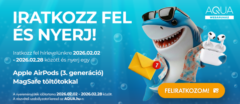 2026.02.02 - 02.28 között minden új hírlevél feliratkozónknak esélye van megnyerni egy Apple AirPods 3-at MagSafe töltőtokkal! Nincs más dolgod, mint legörgetni az oldal aljára és miután bepötyögted a neved és az e-mail címed, feliratkozni a hírlevelünkre. Ezzel már részt is veszel a játékunkban. Így bekerülsz te is a sorsolásba, emellett első kézből tudhatsz meg minden információt az aktuális ajánlatainkkal kapcsolatban! A nyeremény sorsolására a játék lezárulta után legkésőbb 10 munkanappal kerül sor. Nyertest a nyereményjátékra történő jelentkezés során megadott e-mail címen fogjuk értesíteni. A feliratkozással a feliratkozó elfogadja a nyereményjátékban való részvételt, melynek részvételi szabályzata ITT található. Ha kíváncsi vagy a Apple kínálatunkra látogass el az alábbi oldalra: https://aqua.hu/ajanlat/apple