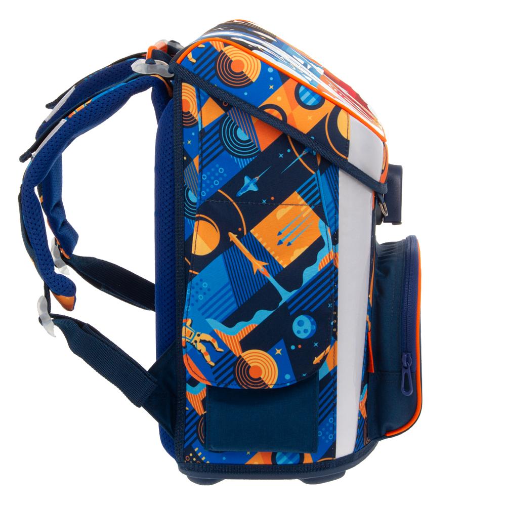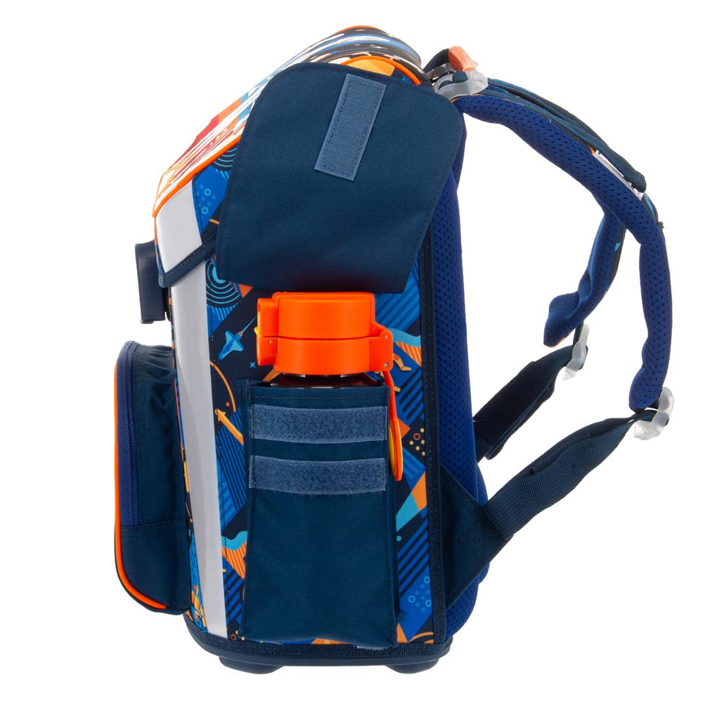 Hátizsák formájú iskolatáska. Könnyű súlyú, formatartó szerkezetű, vízlepergető anyagból. Gerinckímélő, vastagon párnázott, merevített, ergonómikus hátkiképzéssel. Puha, méretre állítható vállpántokkal és plusz állítható pántokkal, amelyekekkel szabályozható, hogy mennyire álljon feszesen a gyerek hátához simulva a táska. Alja tartós kemény műanyag. Nagy felületű fényvisszaverő elemekkel elől, oldalt és a vállpántokon. Felülről könnyen pakolható, teteje FIDLOCK mágneszárral záródik. Belsejében egy textil elválasztó elemmel, két nagy rekesszel. A táska tetején belül átlátszó műanyag órarendtartóval és órarenddel. Oldalán két zsebbel a kulacs részére, elején egy cipzáros zseb az uzsonnás doboz részére. Tetején műanyag fogantyúval. Mérete: 330x410x255 mm. Súlya: 1.2 kg. Táska űrtartalma: 18 l. Terhelhetőség: 12 kg.