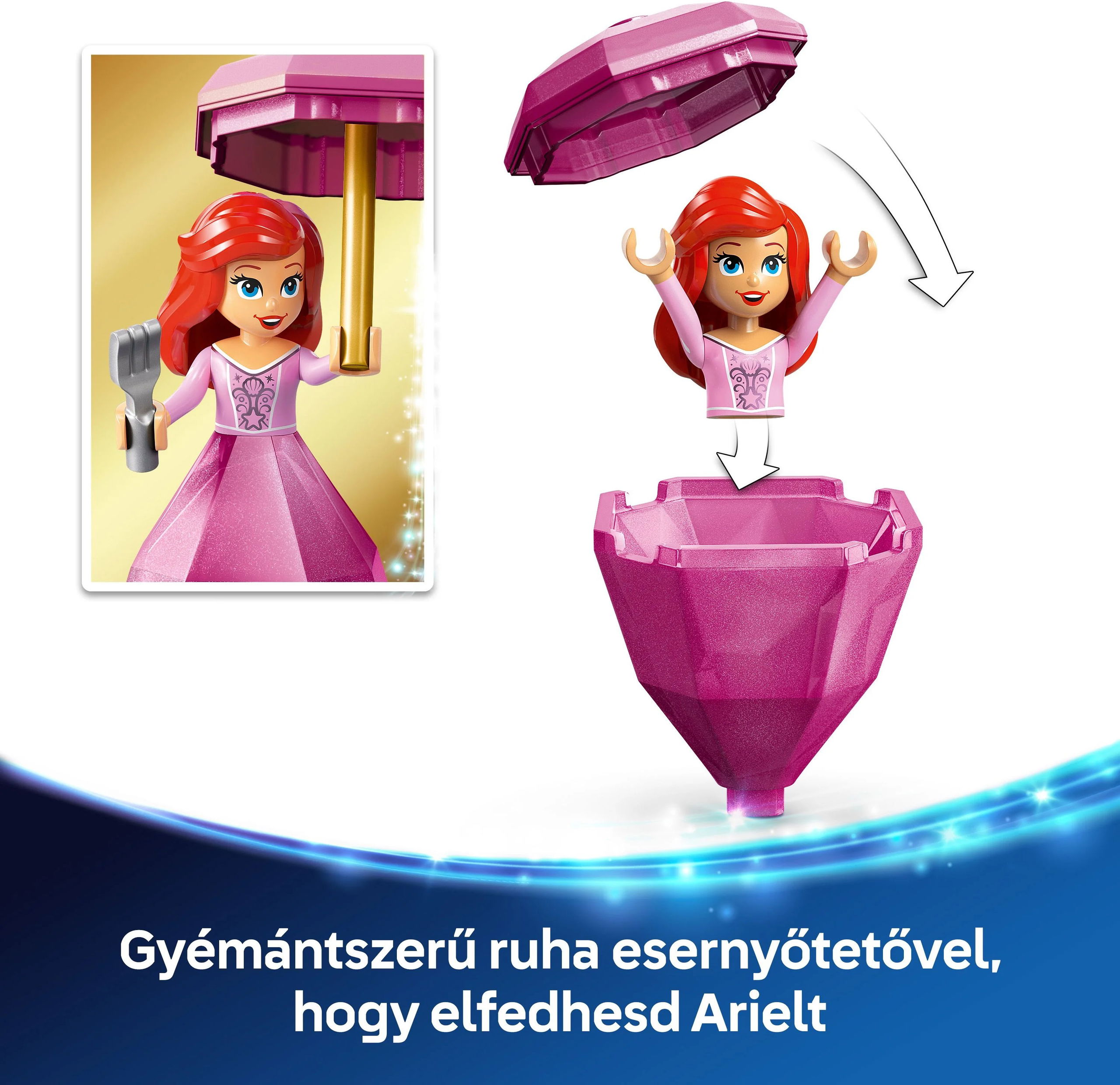 Forgasd meg Ariel-t, aki gyönyörű gyémántruhát visel. Rögzítsd Ariel-t az esernyőjével és Ficánkával a díszes állványra, hogy még varázslatosabb legyen a játékélmény!