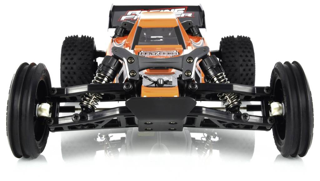 Az 1:10 méretarányú Racing Fighter Buggy súlya valamivel több, mint 1 kg, hossza pedig jó 40 cm, és a nagy tengelytávnak köszönhetően még jobb nyomkövetési stabilitást kínál gyors utazások során. A keskeny, majdnem cső alakú DT-03 alváza védve tartalmazza az elektronikát és mechanikát. Az egyes kerék felfüggesztés, differenciál, olajnyomású lengéscsillapító és a hajlékony polikarbonát karosszéria, amely tartalmazza a klasszikus modellek dizájn elemeit, mind a sorozat kivitelhez tartoznak. A csúcspont az érzékenyen vezérelhető elektronikus fordulatszám-szabályozó.