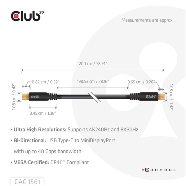 A Club 3D CAC-1561 USB Type-C – MiniDisplayPort™ 2.1 kétirányú DP40™ koaxiális kábel, 4K240Hz, 8K30Hz M/M 2m/6.56ft lehetővé teszi az USB Type-C támogatott (játék) USB-támogatással rendelkező (játék) számítógéphez vagy laptophoz vagy High Resolution™-támogatott monitorhoz. DisplayPort™ 2.1 UHBR10 40 Gb/s-ig, támogatja a Display Stream Compression 1.2-t (DSC), a Forward Error Correctiont, és 32-re növeli a beépített audiocsatornák maximális számát. MiniDisplayPort™ csatlakozóval rendelkezik, ÚJ érintkező ujjakkal, amelyeket kifejezetten ezekhez a nagy sebességekhez terveztek. A puha UltraFlex köpeny megvédi a kábelt a hajlításoktól és a deformációs sérülésektől.