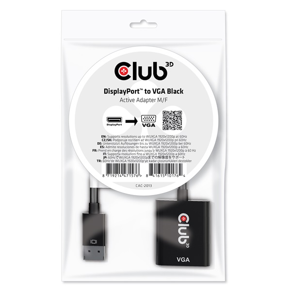 A Club 3D CAC-2013 egy aktív DisplayPort™-VGA jelátalakító, amely lehetővé teszi, hogy az analóg VGA televíziókat, monitorokat vagy projektorokat csatlakoztassuk a DisplayPort™ kimenettel rendelkező asztali számítógépekhez vagy laptopokhoz. Az adapter plug and play funkciót kínál, nincs szükség illesztőprogram telepítésére, és a DisplayPort™ kimenet táplálja.