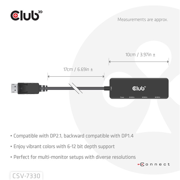 Club3D Átalakító - (DisplayPort 2.1 to 3xHDMI, 8K60Hz, HDR, HDCP 2.3, HPD, ALT mode) (CSV-7330)