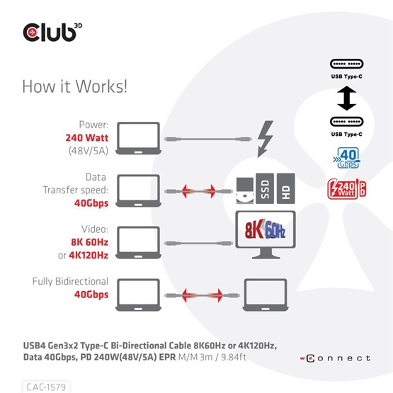 Club3D USB4 Gen3x2 Type-C Bi-Directional Cable 8K60Hz or 4K120Hz, Data 40Gbps, PD 240W(48V/5A) EPR M/M 3m (CAC-1579)