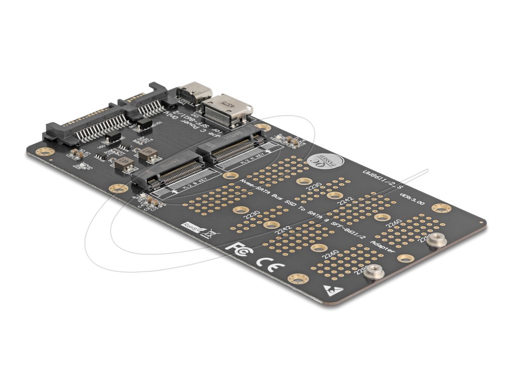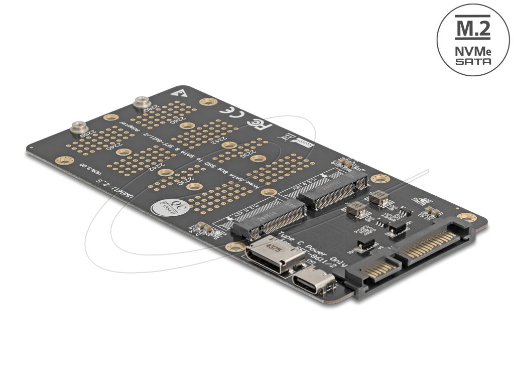 Ez a Delock átalakító egy 2280, 2260, 2242 és 2230 formátumú M.2 SSD csatlakoztatását teszi lehetővé a B aljzattal, illetve egy 2280, 2260, 2242 és 2230 formátumú M.2 SSD csatlakoztatását az M aljzattal. Az átalakítóval lehetősége van egy PCIe alapú M.2 SSD-t és egy SATA alapú M.2 SSD-t egyidejűleg csatlakoztatni. Az átalakító a használt SSD típusától függően SATA interfészen keresztül csatlakozik a SATA M.2 SSD-hez, illetve SFF-8612 interfészen keresztül a PCIe M.2 SSD-hez.