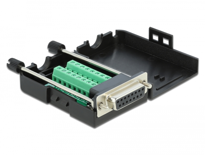 Ez a csatlakozóblokkal ellátott Delock adapter csupasz vezetékek csatlakoztatására használható. Az adapter nem csak speciális ipari célokra, hanem szabadidős tevékenységekhez (pl. vasúti modellezéshez) is megfelelő. Házzal történő védelem A műanyag ház megvédi a PCB-t a szennyeződéstől és a károsodástól. Túlfeszülés védelem A becsavarozható tehermentesítő rögzíti a kábelt a házban. Műszaki adatok Csatlakozó: 1 x soros Sub-D15 anya (2 sor) csavarokkal 1 x 16 tűs csatlakozóblokk Pólus kiosztás: 1:1 Vezetékek középvonala közötti távolság: 3,81 mm 26 18 AWG vezetékméretű kábelekhez használható Működési hőmérséklet: -20 C ~ 105 C Méretek (HxSzxM): kb. 78 x 42 x 21 mm Rendszerkövetelmények Egy szabad Sub-D15 csatlakozóport A csomag tartalma Adapter 1 x túlfeszülés-gátló 2 x rögzítő csavar Csomag Zárható műanyag tasakGyártó: Delock