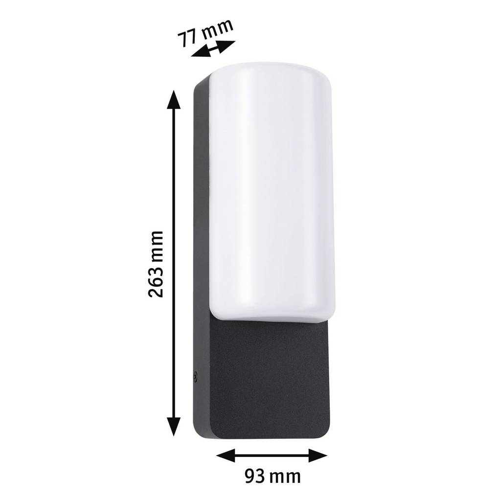Műszaki adatok: 2021-es energiahatékonysági osztályok: n.rel. · Anyag: Alumínium · Fényforrás típus: LED · Fényforrások száma: 1 · Fényforrással: Igen · Fényszín: 3000 K · Fényszín (fényforrás): Melegfehér · Fényáram összesen: 560 lm · Fényáram/fényforrás (lumen): 560 lm · Gyártói szín: Antracit · Helyiség: Ház/garázs, Járda megvilágítás, Terasz/ülősarok, Hangulatos kertvilágítás, Nedves helyiség · Kivitel (lámpa): Derékszögű · Méret, magasság: 263 mm · Méret, mélység: 77 mm · Méret, szélesség: 93 mm · Stílus: Modern/dizájn · Teljesítmény: 8.5 W · Teljesítmény fényforrásonként: 8.5 W · Védelmi típus: IP44 · Üzemi feszültség: 230 V