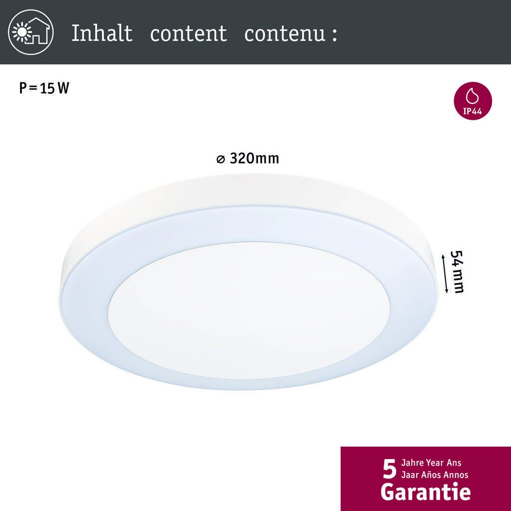 Technical specifications: 2021-es energiahatékonysági osztályok: n.rel. · Fényforrások száma: 1 · Fényforrással: Igen · Fényszín: 2200 K · Fényszín (fényforrás): Melegfehér · Fényáram összesen: 880 lm · Fényáram/fényforrás (lumen): 880 lm · Kivitel: Kerek · Méret, magasság: 54 mm · Space (lights): Ház/garázs,Járda megvilágítás,Terasz/ülősarok,Hangulatos kertvilágítás,Nedves helyiség · Szín: Fehér · Teljesítmény: 14 W · Teljesítmény fényforrásonként: 14 W · Védelmi osztály: II · Védelmi típus: IP44 · Átmérő: 320 mm