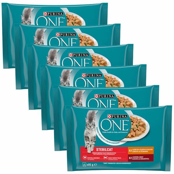 PURINA ONE STERILCAT tasakos eledel - multi-pack csirkéből és zöldbabból szaftban, marhából és sárgarépával szószban. - Segít csökkenteni az ásványi anyagokkoncentrációját, melyek vesekövek képződéséhez vezethetnek, így segítve egészségesen tartani a húgyutakat