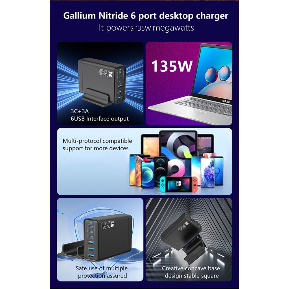 BlackBird GAN 135W 3xUSB-C 20W + 3xUSB 5V hálózati töltő fekete (BH1669)