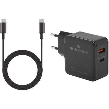 Bluestork USB-C + USB-A 65W hálózati töltő + 1,8m USB-C kábel fekete (PW-BS-65-GAN-C-A)