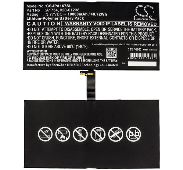 Cameron Sino Li-Polymer akku (3.77V/10800mAh, Apple 020-01238 kompatibilis) FEKETE Apple IPAD Pro 12.9 (2017) "Gigapack csomagolás" (CS-IPA167SL)