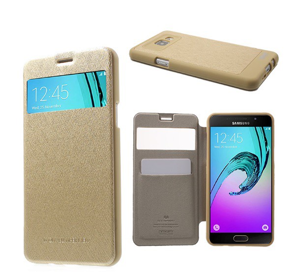 MERCURY Wow Bumper tok álló, bőr hatású (FLIP, oldalra nyíló, S-View cover, textil minta) ARANY [Samsung Galaxy A5 (2016) SM-A510F]