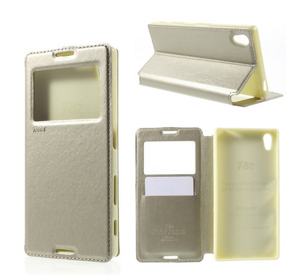 ROAR NOBLE VIEW tok álló, bőr hatású (FLIP, oldalra nyíló, asztali tartó funkció, View Window) ARANY [Sony Xperia Z5 (E6653)]