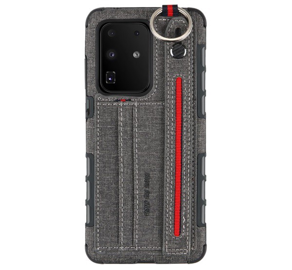 Szilikon telefonvédő (közepesen ütésálló, asztali tartó funkció, bankkártya tartó, textil hátlap + kézpánt) SZÜRKE [Samsung Galaxy S20 Ultra (SM-G988F