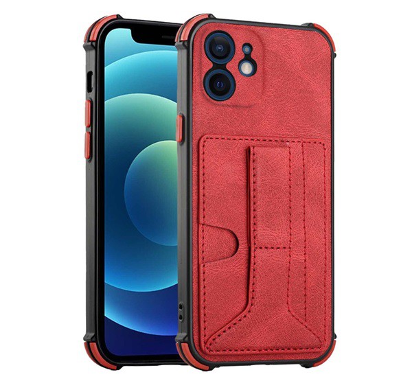Szilikon telefonvédő (közepesen ütésálló, bőr hatású, bankkártya tartó, asztali tartó funkció + kézpánt) PIROS [Apple iPhone 12 mini]