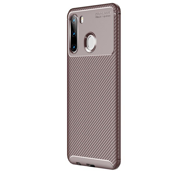 Szilikon telefonvédő (közepesen ütésálló, légpárnás sarok, karbon minta) BARNA [Samsung Galaxy A21 (SM-A210F)]