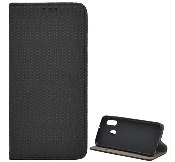 Tok álló, bőr hatású (FLIP, oldalra nyíló, asztali tartó funkció, rombusz minta) FEKETE [Samsung Galaxy A20e (SM-A202F)]