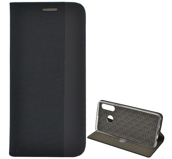 Tok álló, bőr hatású (FLIP, oldalra nyíló, asztali tartó funkció, textil minta) FEKETE [Huawei P30 Lite (Nova 4e)]
