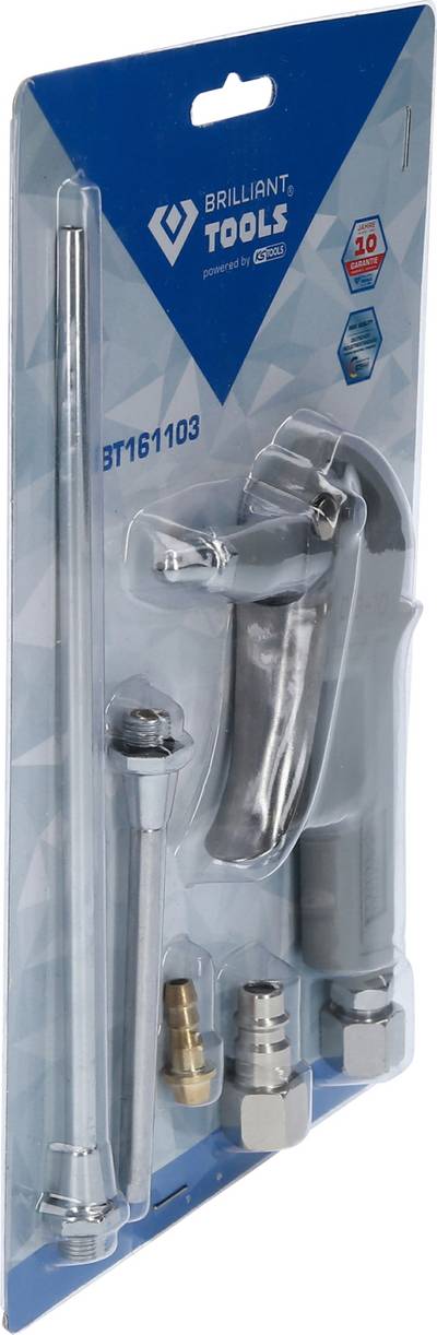 A BRILLIANT TOOLS BT161103 sűrített levegős fúvópisztolyt 3 db 25 mm, 10 cm és 20 cm hosszúságú fúvókával szállítjuk. Így könnyedén bejuthat a legszűkebb helyekre is. A mindössze 130 g súlyú kialakítás különösen praktikus, és kényelmes munkát tesz lehetővé. A sűrített levegős fúvópisztoly szabványos 1/4" -es gyorscsatlakozóval, valamint egy 6 mm-es tömlőcsatlakozóval rendelkezik, amely hollandi anyával van a fúvópisztolyhoz rögzítve.