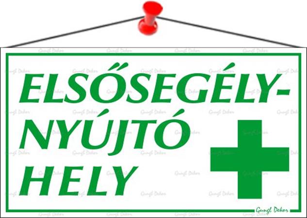 Elsősegélynyújtó hely információs tábla- fehér alapon zöld szöveg- anyaga: hullámos műanyaglemez, damil akasztóval- mérete: 22,5x12,5 cm