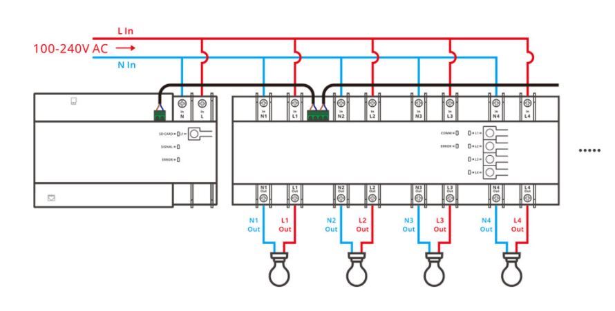 A négy áramkörös relémodul egy fázis kezelésére alkalmas, minden áramköre azonos feszültség (100-240V AC) kapcsolására képes.