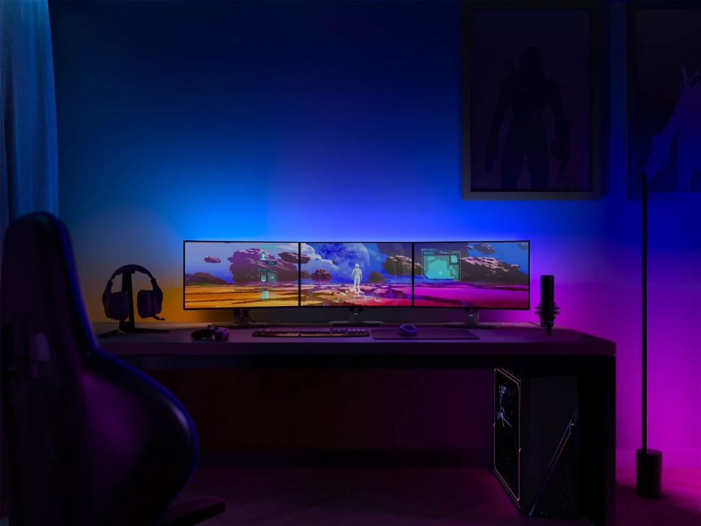 A Hue Play gradient lightstrip az egy- vagy hárommonitoros rendszer hátuljára rögzíthető, és könnyen hajlítható a sarkok körül.