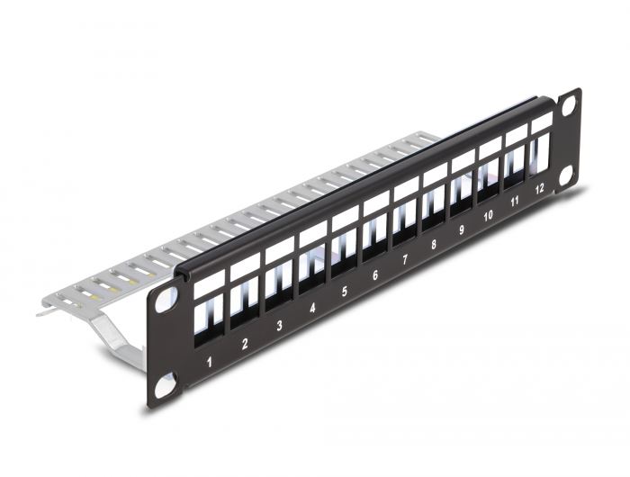 Delock 10” hálózati szekrényekhez Keystone patch panel 12 porttal és tehermentesítővel 1U fekete (66874)