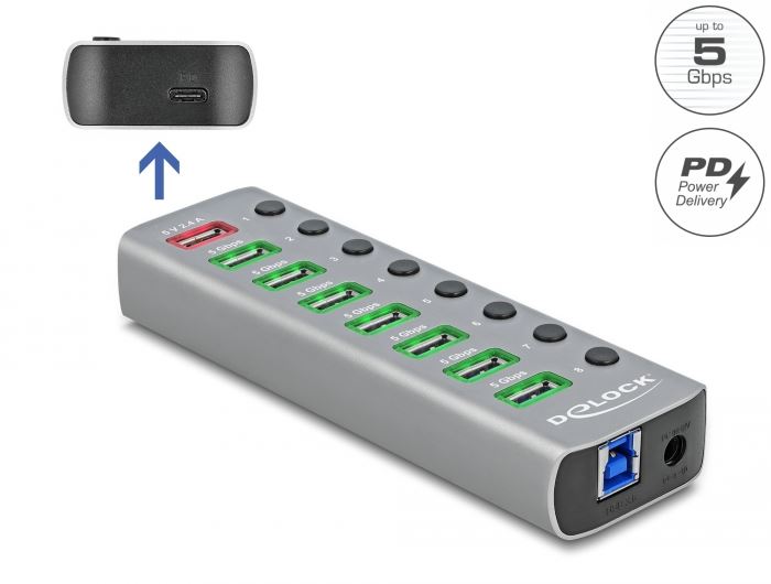 Delock USB 5 Gbps hub 7 porttal valamint 1 gyorstöltő porttal és 1 USB-C PD 3.0 porttal kapcsolóval és megvilágítással (63264)