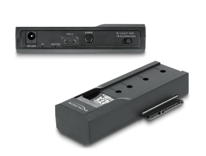 Ez a Delock átalakító lehetővé teszi a kapcsolatot egy M.2 NVMe vagy SATA SSD között 2280, 2260, 2242 és 2230 formátumban, vagy egy 2.5 vagy 3.5 SATA HDD vagy SSD között USB interfészen keresztül. Műszaki adatok Csatlakozó: 1 x USB 10 Gbps USB Type-C hüvely 1 x M.2 M-kulcs nyílás 1 x 22 érintkezős SATA 6 Gb/s hüvely 1 x DC aljzat Lapkakészlet: Realtek RTL9210B M.2 modulok használatát támogatja 2280, 2260, 2242 és 2230 formátumban SATA vagy PCIe (NVMe) alapú M- vagy B+M-kulccsal Az összetevők maximális magassága a modulon: A kétoldalas összeszerelt modulok 1,5 mm-es alkalmazása támogatott 2.5 és 3.5 SATA HDD / SSD számára Támogatja a NVM Express (NVMe) használatát Támogatja a S.M.A.R.T. használatát Támogatja a TRIM használatát Támogatja a Native Command Queuing (NCQ) technológiát Akár 10 Gbps sebességű adatátvitel Támogatja a UASP használatát 2 x LED jelzőfény a tápfeszültség és elérés jelzéséhez Rendszerindításra alkalmas Funkció gomb: 1 x főkapcsoló 1 x kapcsoló M.2-höz vagy 2.5 / 3.5 meghajtóhoz Méretek (HxSzxM): kb. 107 x 35 x 24 mm Hot Plug, Plug & Play A tápegység műszaki adatai Fali tápegység Bemenet: AC 100 ~ 240 V / 50 ~ 60 Hz / 1,5 A Kimenet: 12 V / 2 A Földelés kívül, pozitív belül Méret: belül: o kb. 2,5 mm kívül: o kb. 5,5 mm hosszúság: kb. 10 mm Rendszerkövetelmények Android 9.0 vagy újabb Chrome OS Linux Kernel 5.15 vagy újabb Mac OS 12.4 vagy újabb Windows 10/10-64/11 iPad Air (4. generáció) vagy újabb iPad Pro (3. generáció) vagy újabb Surface Pro 7 PC vagy notebook számítógép szabad USB A-típusú-csatlakozóval vagy Egy szabad USB Type-C porttal vagy egy szabad Thunderbolt 3 porttal rendelkező eszköz vagy Thunderbolt 4 A csomag tartalma USB Type-C -es átalakító Kábel USB-C csatlakozódugóval és USB-C csatlakozódugóval, hossza kb. 80 cm Kábel USB-C csatlakozódugóval és USB A-típusú csatlakozódugóval, hossza kb. 80 cm 3 x gumi csődugó Külső tápegység 12,0 V / 2,0 A Használati utasítás Csomag Retail BoxGyártó: Delock